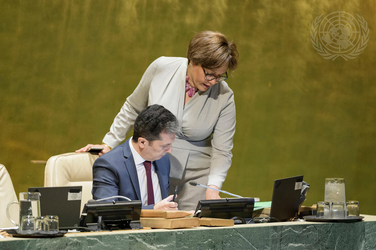 Movses Abelian (seated), Assistant Secretary-General for General Assembly and Conference Management, and Ruth de Miranda, Director of the General Assembly and Economic and Social Council (ECOSOC) Affairs Division, speak during the meeting.