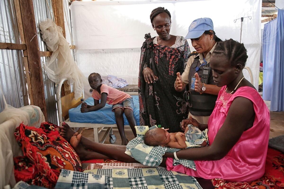 United Nations police officers serving with the United Nations Mission in South Sudan (UNMISS), specializing in gender, child and vulnerable people protection, meet with women suffering from domestic violence and health issues in the Protection of Civilians site in Juba, South Sudan.