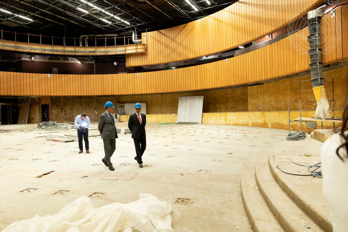 Michael Møller (centre), Director-General of the United Nations Office at Geneva (UNOG), and Ali Al-Mansouri (right) Permanent Representative of Qatar to the United Nations Office at Geneva, visit the renovation of Room XIX in the Palais des Nations, Geneva.