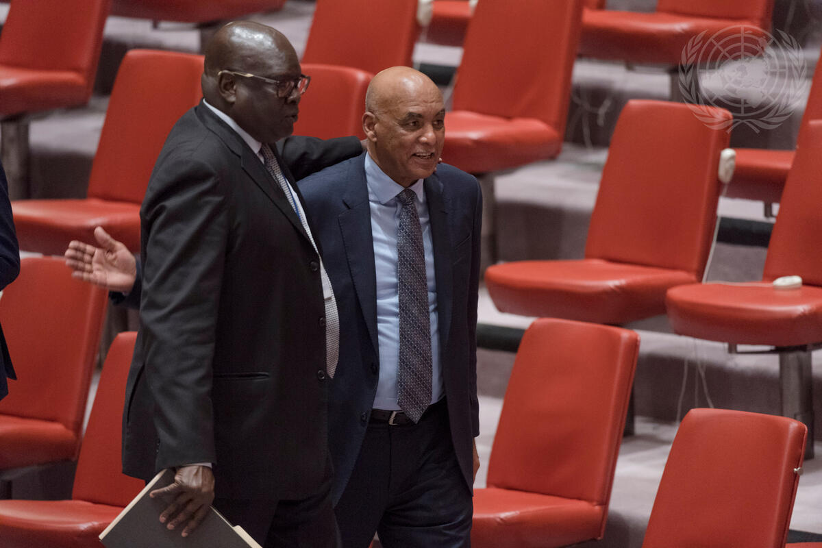 Akuei Bona Malwal (left), Permanent Representative of the Republic of South Sudan to the United Nations, speaks with Omer Dahab Fadl Mohamed, Permanent Representative of the Republic of Sudan to the United Nations, following the Security Council meeting on the situation in the Sudan and South Sudan.