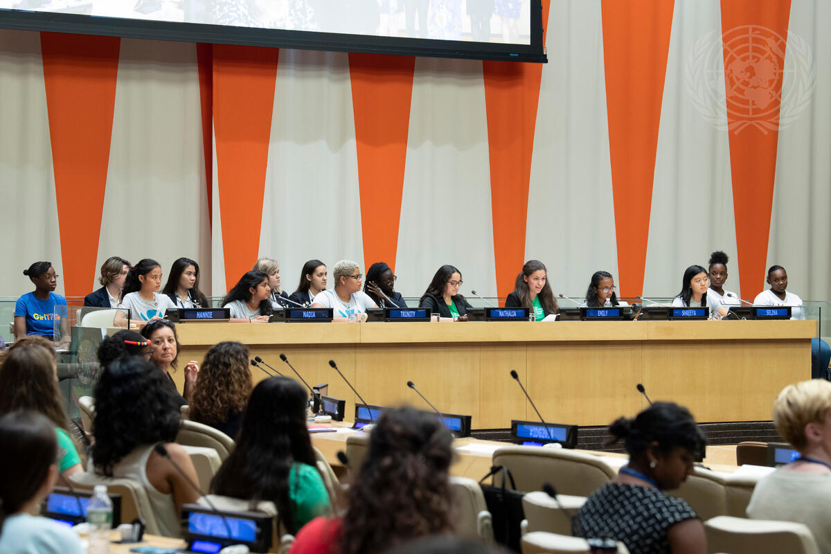 Emily (centre right) speaks at the sixth annual ""Girls Speak Out"" special event on the occasion of the International Day of the Girl.