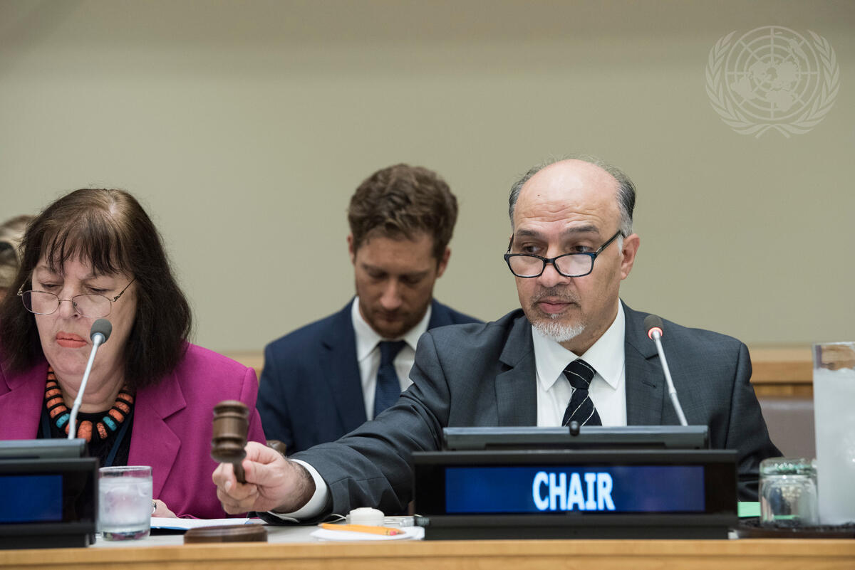 Mahmoud Saikal (right), Permanent Representative of Afghanistan to the UN, chairs the meeting of the Third Committee (Social, Humanitarian and Cultural Issues) on Promotion and protection of the rights of children. At left is Virginia Gamba, Special Representative of the Secretary-General for Children and Armed Conflict.