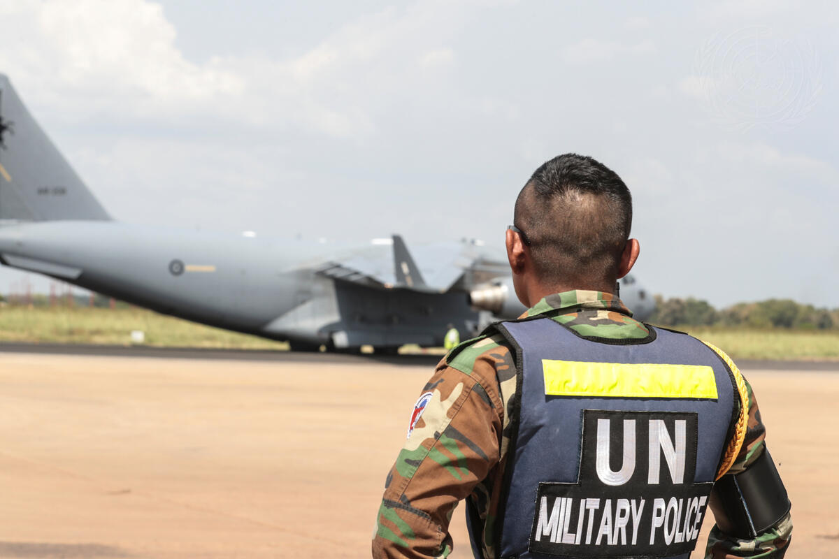 A military police serving with UNMISS watches as a plane arrives in Juba.