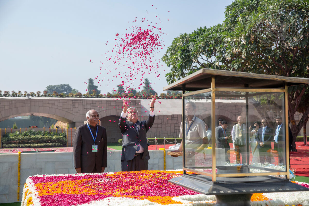 Secretary-General António Guterres (right), in India on the holiday celebrating Mahatma Ghandi's birthday, throws flower petals during a ceremony at Raj Ghat, the national memorial to Gandhi.