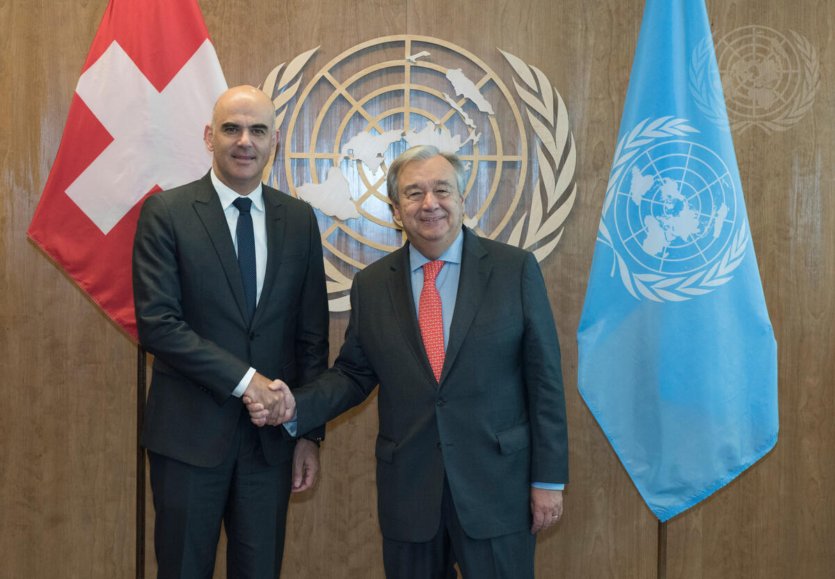 Secretary-General António Guterres (right) meets with Alain Berset, President of the Swiss Confederation.