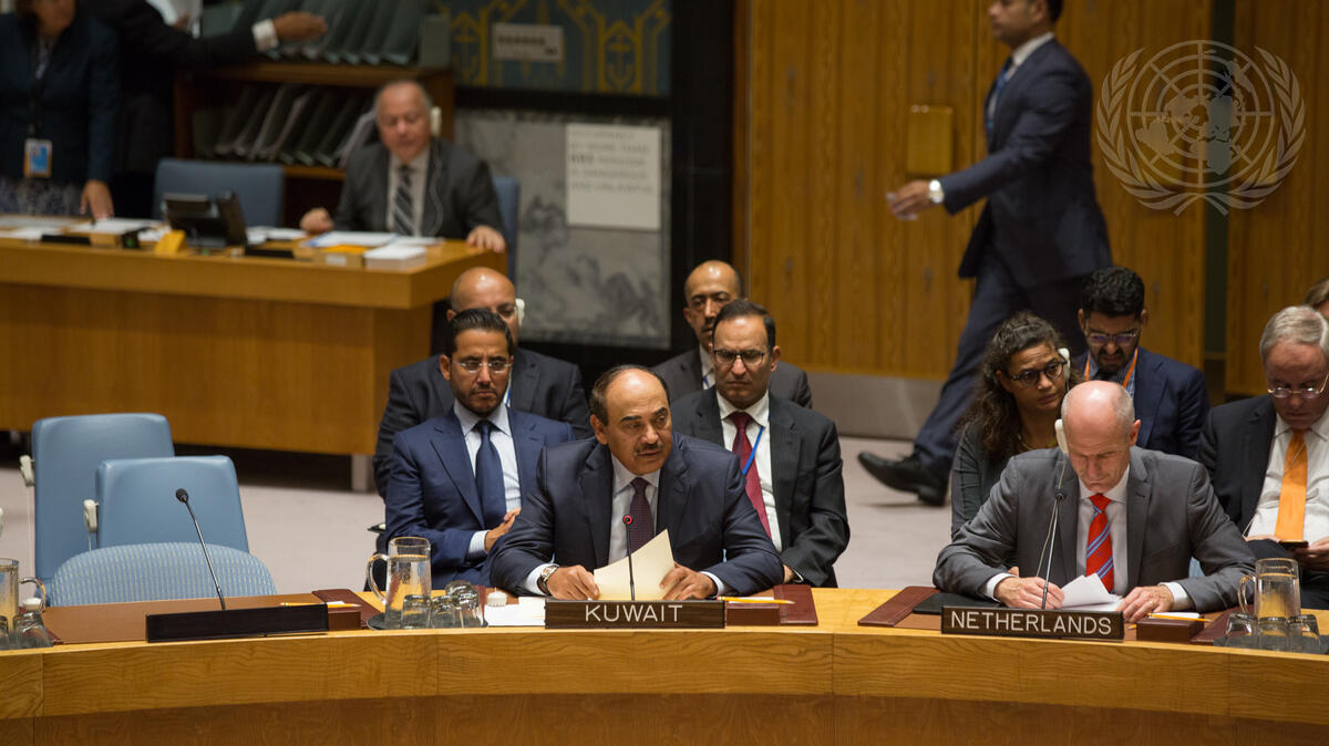 Sheikh Sabah Khalid Al Hamad Al Sabah, Deputy Prime Minister and Minister for Foreign Affairs of the State of Kuwait, addresses the Security Council meeting on non-proliferation and the Democratic People’s Republic of Korea. At right is Stef Blok, Minister of Foreign Affairs of the Kingdom of the Netherlands.