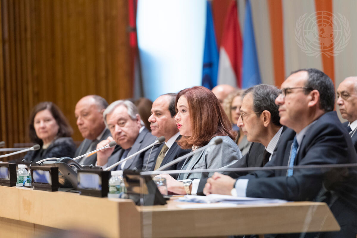 Also pictured (left to right): Maria Luiza Ribeiro Viotti, Chef de Cabinet to Secretary-General António Guterres; Sameh Hassan Shokry Selim, Minister for Foreign Affairs of Egypt; Secretary-General António Guterres; Abdel Fattah al-Sisi; Assistant Minister for Foreign Affairs of Egypt; and Mourad Ahmia, Executive Secretary of the Group of 77.