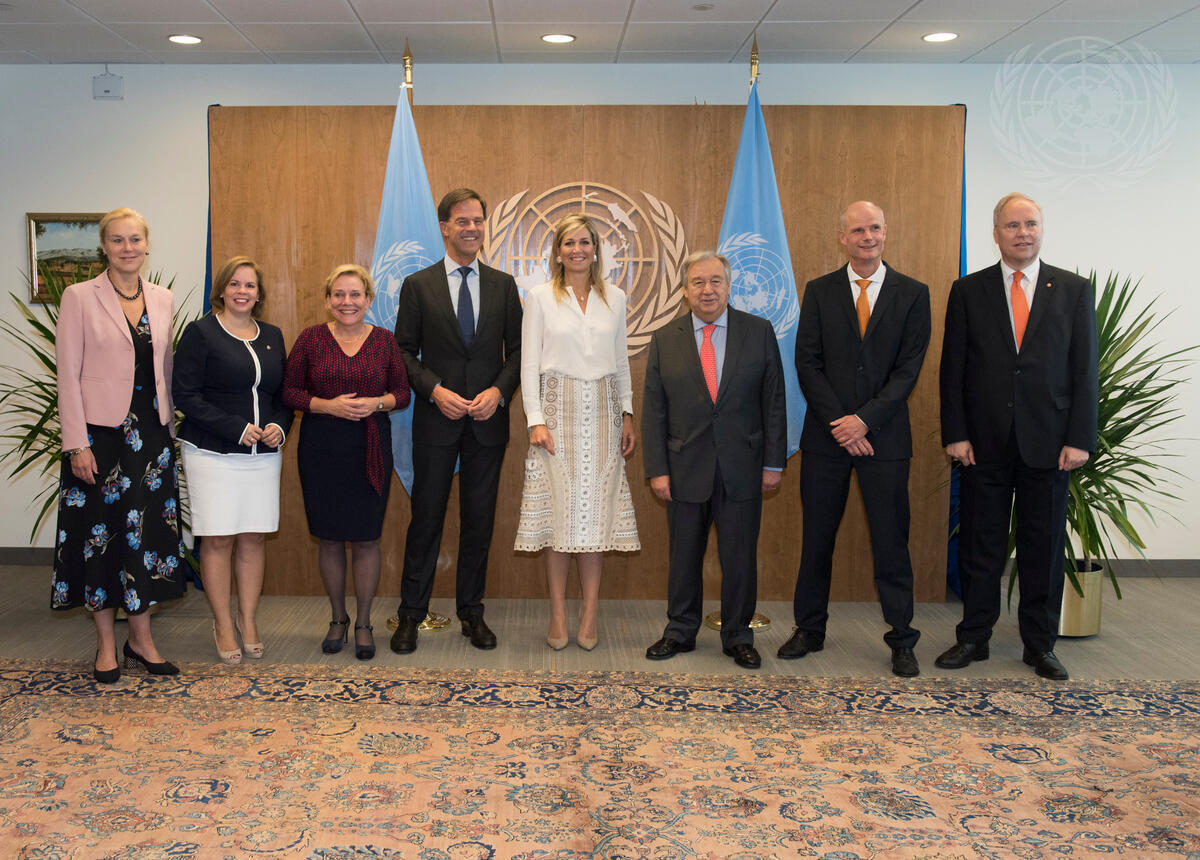 Secretary-General António Guterres (third from right) meets with Mark Rutte (centre left), Prime Minister and Minister for General Affairs of the Kingdom of the Netherlands, Queen Máxima (centre right), and members of the Government of the Kingdom of the Netherlands.