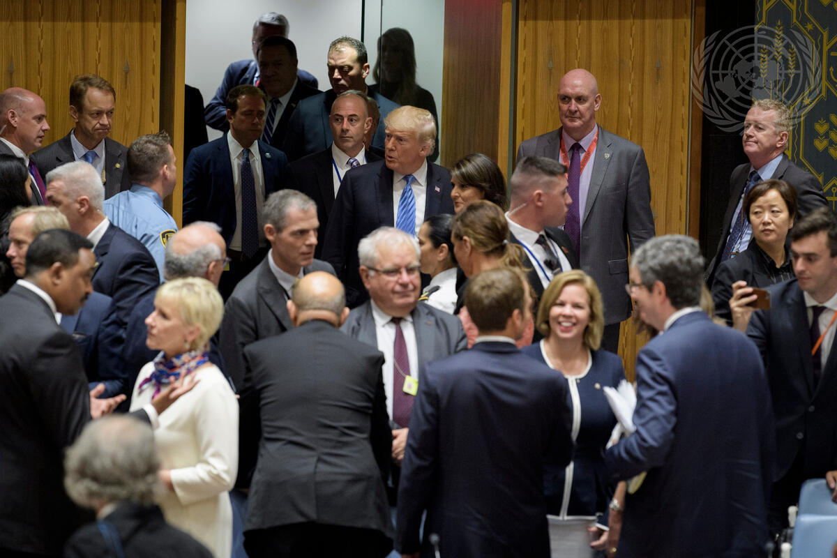 Donald Trump (centre by door), President of the United States of America and President of the Security Council for the month of September, arrives at the Council chamber prior to the meeting on the maintenance of international peace and security, with a focus on non-proliferation of weapons of mass destruction.