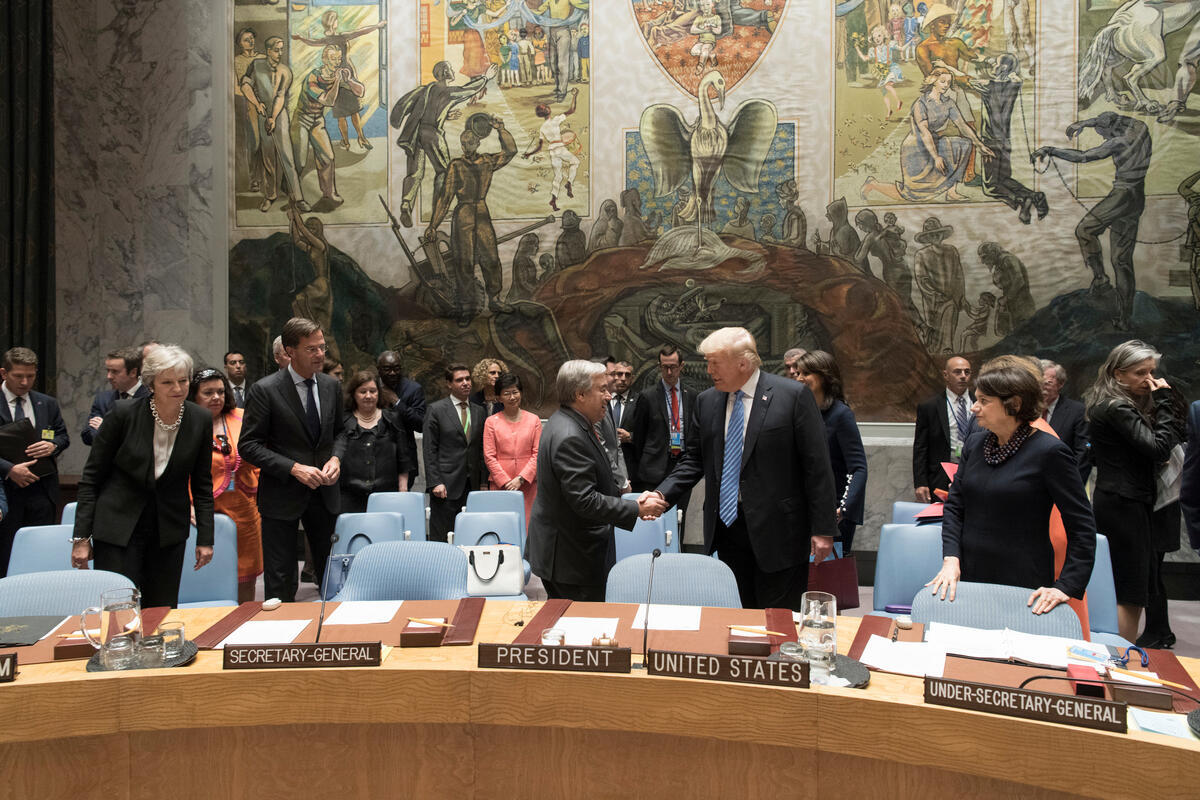 Secretary-General António Guterres (centre left) greets Donald Trump, President of the United States of America, before the Security Council meeting on the maintenance of international peace and security, with a focus on non-proliferation of weapons of mass destruction.