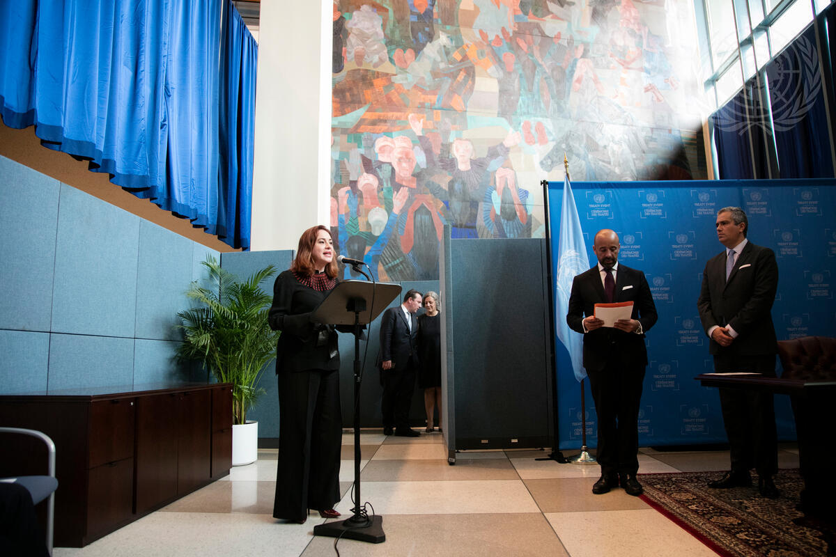 María Fernanda Espinosa Garcés (at podium), President of the seventy-third session of the General Assembly, speaks at an event for on the Treaty for the Prohibition of Nuclear Weapons.