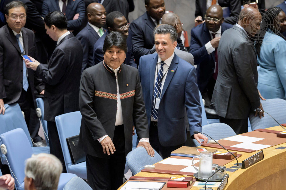 Evo Morales Ayma (left), President of the Plurinational State of Bolivia, and Sacha Sergio Llorenty Soliz, Permanent Representative of Bolivia to the United Nations, await the start of the Security Council meeting on the maintenance of international peace and security, with a focus on non-proliferation of weapons of mass destruction.