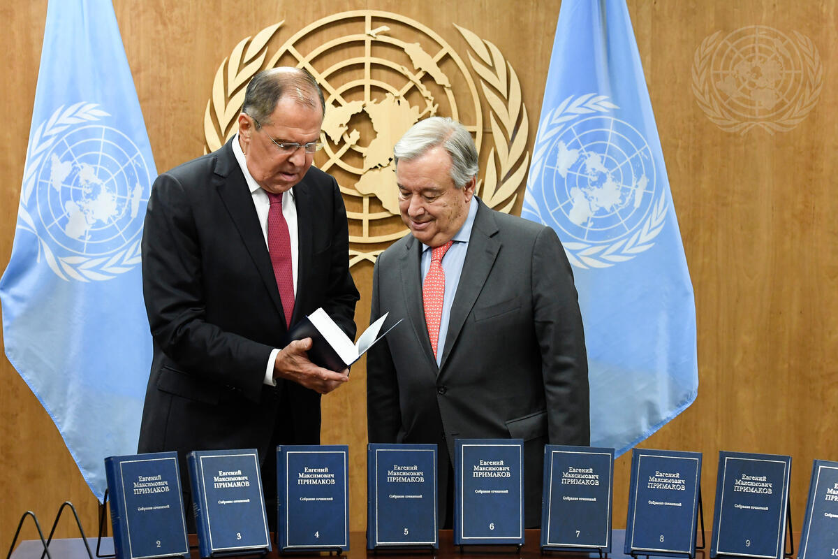 Secretary-General António Guterres (right) meets with Sergey V. Lavrov, Minister for Foreign Affairs of the Russian Federation. Mr. Lavrov is donating a collection of books by Yevgeny Primakov, Russian diplomat and politician, to the UN Library.