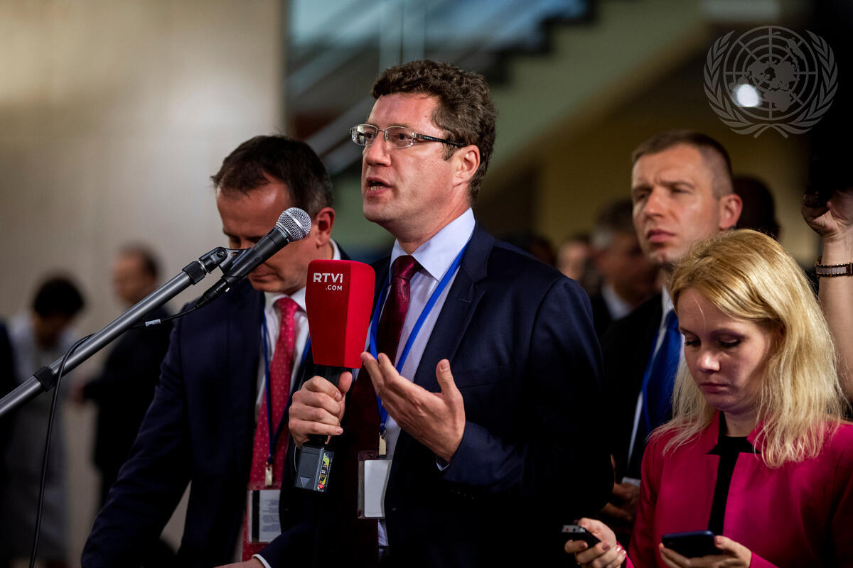A journalist from RTVI, a Russian television network, asks a question during a press enounter with Andrzej Duda, President of the Republic of Poland.