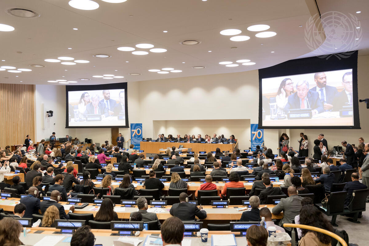 Secretary-General António Guterres (on screens), delivers remarks during the high-level meeting on ""The Universal Declaration of Human Rights: a prevention tool to achieve peace and sustainable development"", held on the margins of the general debate of the seventy-third General Assembly.