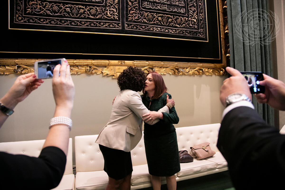 María Fernanda Espinosa Garcés (right), President of the seventy-third session of the General Assembly, greets Epsy Campbell Barr, First Vice-President and Minister for Foreign Affairs of the Republic of Costa Rica, during a welcome reception prior to the opening of the seventy-third session of the General Assembly.