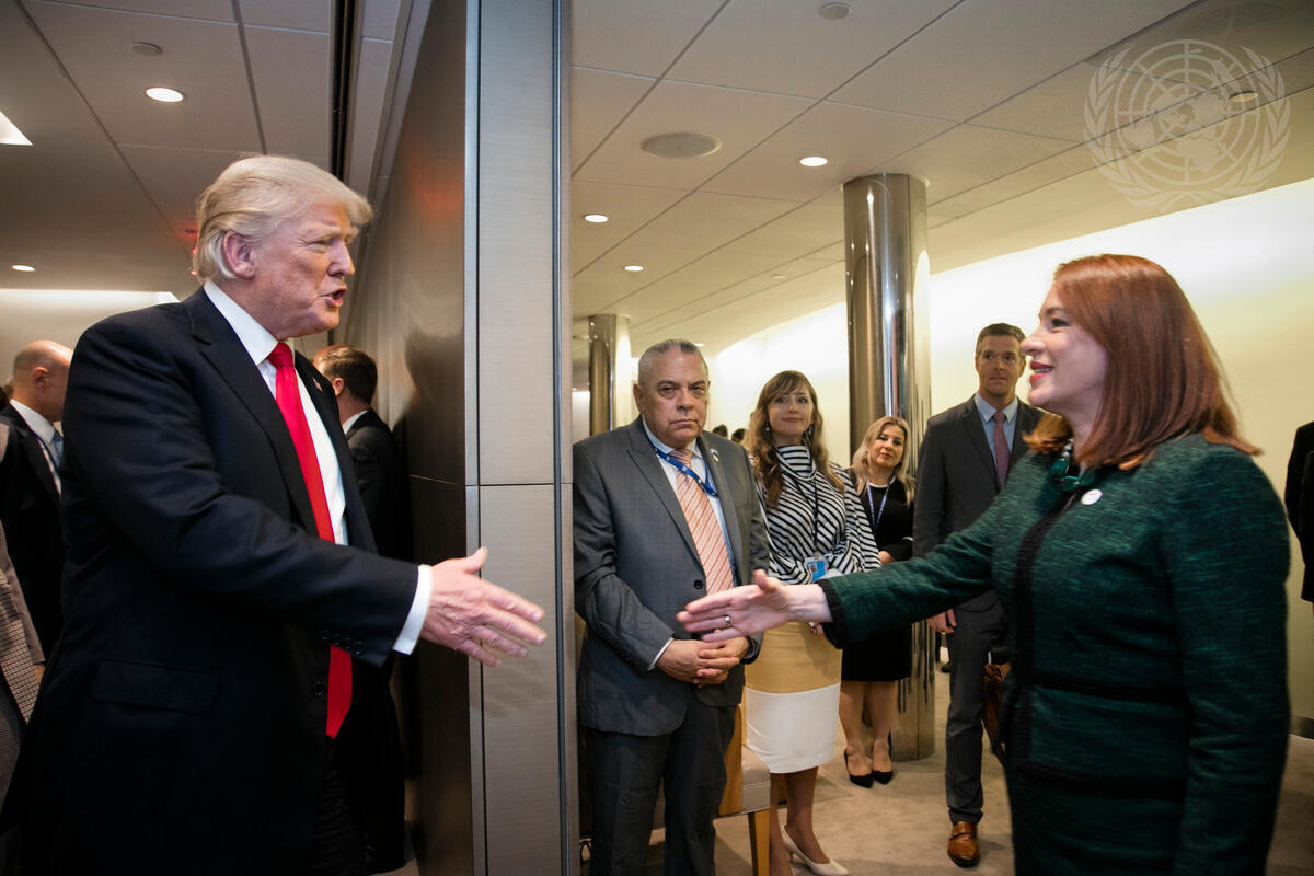 María Fernanda Espinosa Garcés (right), President of the seventy-third session of the General Assembly, greets Donald Trump, President of the United States of America.