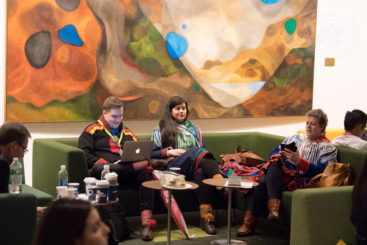 Attendees of the opening day of the seventeenth session of the UN Permanent Forum on Indigenous Issues take a break between events.
