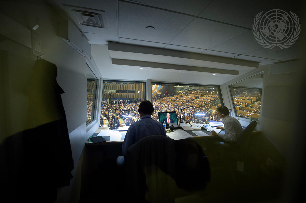 Two interpreters at work in their booth as Donald Trump, President of the United States of America, addresses the general debate of the General Assembly’s seventy-third session.