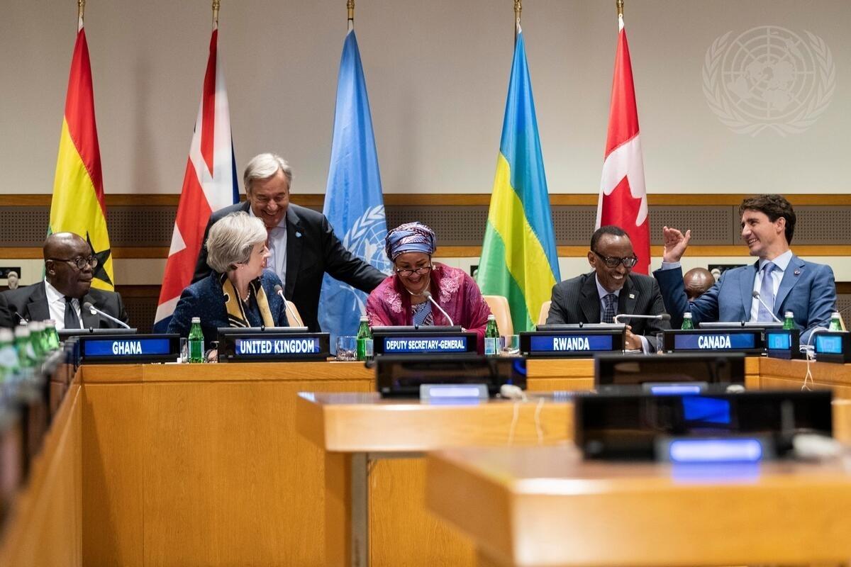 Also pictured (seated left to right): Nana Addo Dankwa Akufo-Addo, President of the Republic of Ghana; Teresa May, Prime Minister of the United Kingdom of Great Britain and Northern Ireland; Deputy Secretary-General Amina Mohammed; Paul Kagame, President of the Republic of Rwanda; and Justin Trudeau, Prime Minister of Canada.