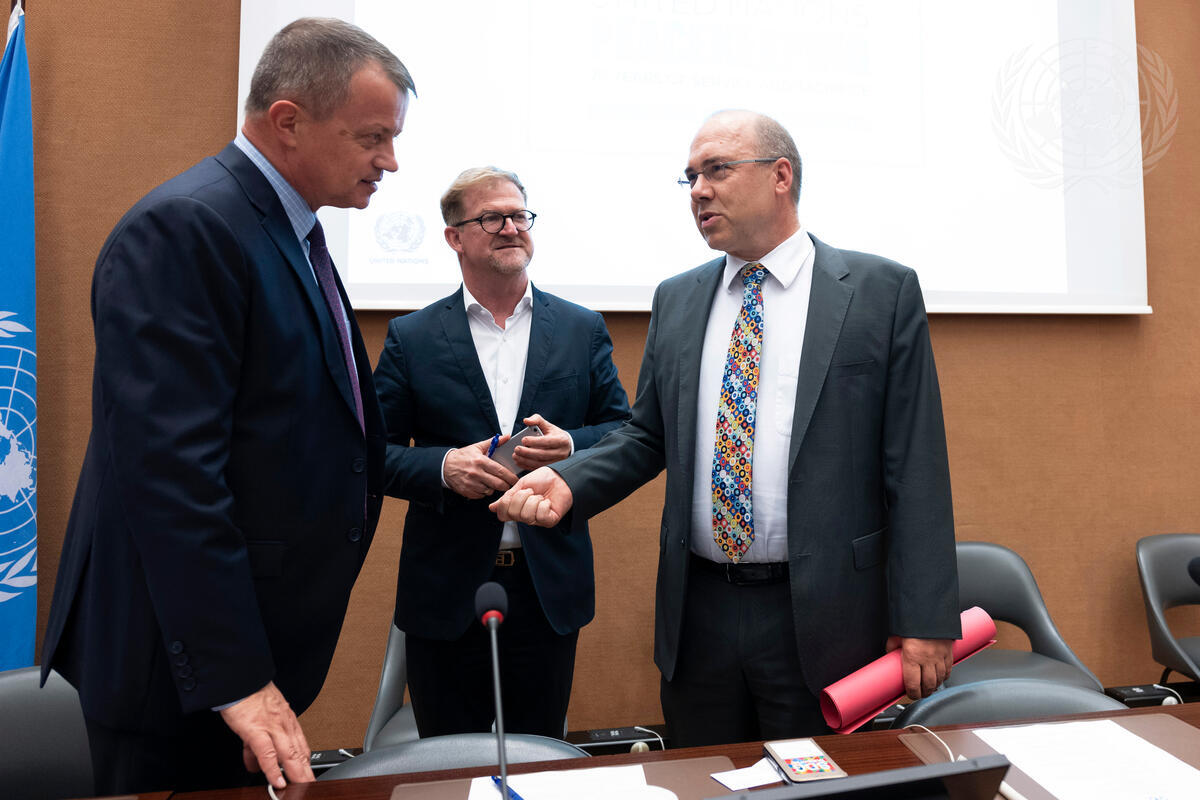 Clemens Adams (right), Director of Administration at UNOG, speaks with General Jean Baillaud (left), former Deputy Commander of the UN Organization Stabilization Mission in the Democratic Republic of the Congo (MONUSCO), and