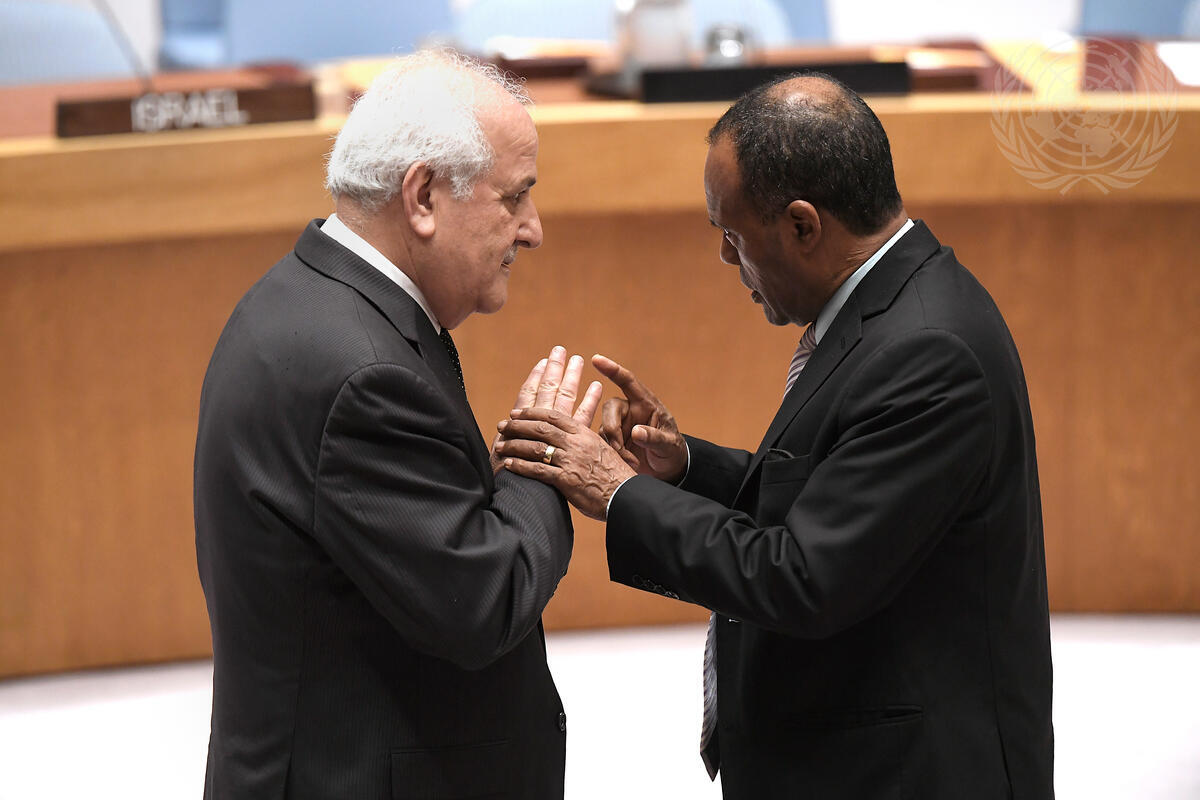 Riyad H. Mansour (left), Permanent Observer of the State of Palestine to the UN, speaks with Tekeda Alemu, Permanent Representative of Ethiopia to the UN, before the Security Council meeting on the situation in the Middle East, including the Palestinian question.