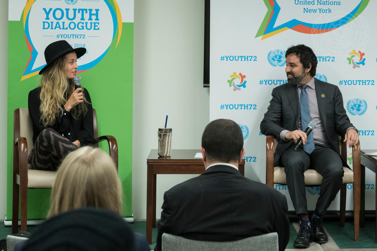 Chantelle Sladics (left), Professional Snowboarder, speaks during a dialogue on the theme ""Lets talk about sports! Why sports and development go hand in hand"". To the right is Moderator Brenden Varma, Spokesperson for the President of the General Assembly.