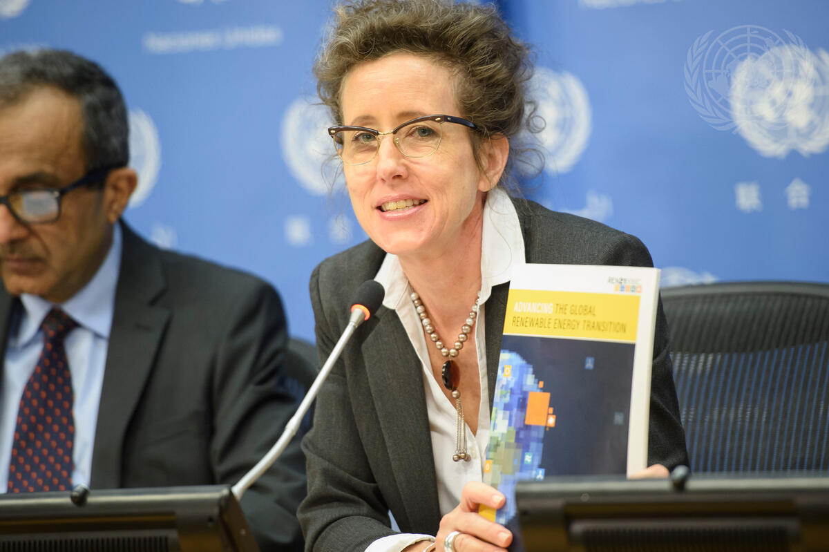 Laura Williamson, Director of Outreach & Communication of REN21 (the Renewable Energy Policy Network for the 21st Century), speaks at a press conference by the United Nations Environment Programme (UNEP) on the launch of REN21’s Renewables 2018 Global Status Report. To her right is Jamil Ahmad, Director of Intergovernmental Affairs of UNEP.