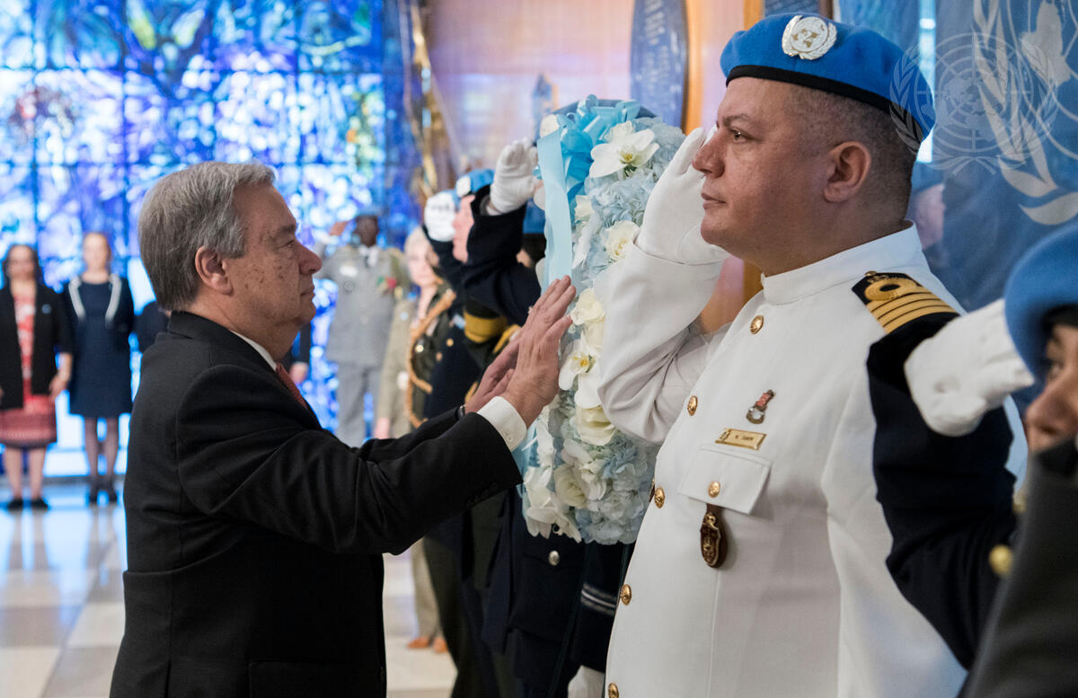 Secretary-General António Guterres (left) places a wreath in honour of fallen peacekeepers in observance of the International Day of United Nations Peacekeepers (29 May).