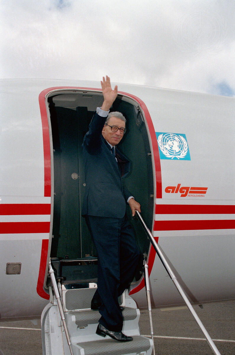 Secretary-General Boutros Boutros-Ghali waving to well-wishers at Jomo Kenyatta Airport at the conclusion of his visit to Kenya.
