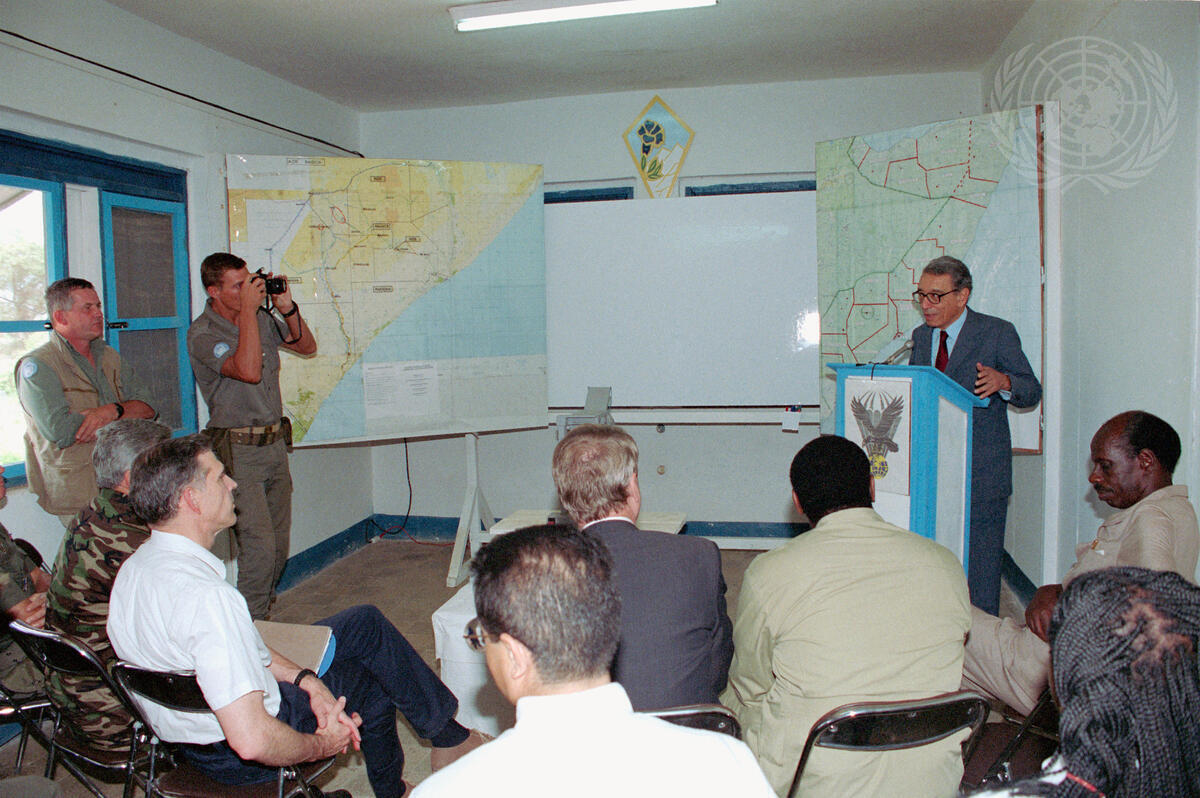 Boutros Boutros-Ghali, Secretary-General of the United Nations, observes United Nations Day, during his visit to Somalia. Photo shows the Secretary-General (at podium) speaking to staff members of the Second United Nations Operations in Somalia (UNOSOM II). Among those listening is the Secretary-General's Special Representative for Somalia, Admiral Jonathan T. Howe (third from left, seated with hands clasped).
