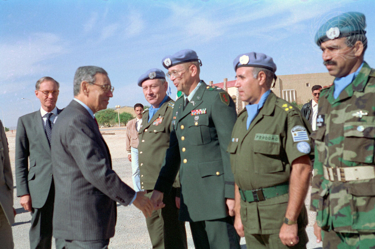 Boutros Boutros-Ghali, Secretary-General of the United Nations, is shown greeting Colonel Vadim Gerasimov, Senior Liaison Officer, United Nations Mission for the Referendum in Western Sahara (MINURSO). Erik Jensen, Deputy Special Representative.