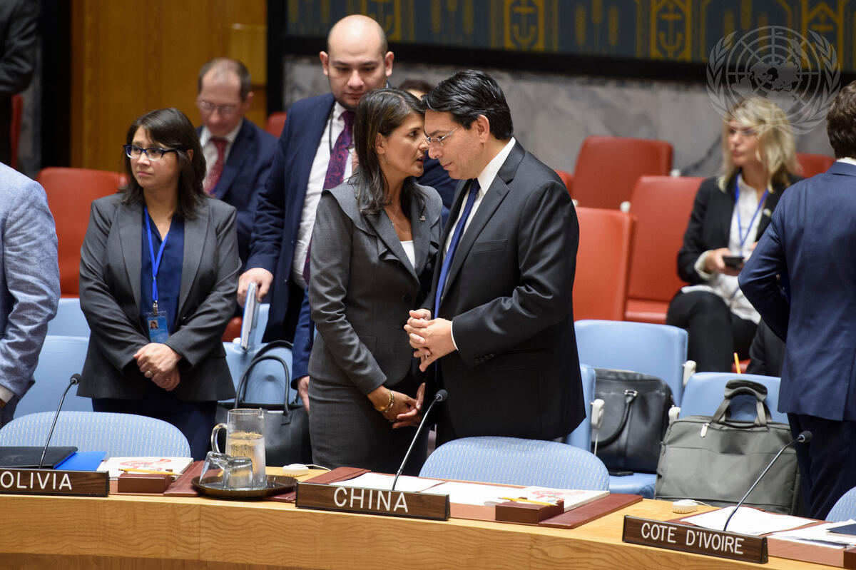 Nikki R. Haley (centre left), Permanent Representative of the United States to the UN, speaks with Danny Danon, Permanent Representative of Israel to the UN, before the Security Council meeting on the situation in the Middle East, including the Palestinian question.