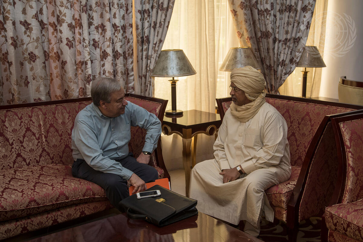 Secretary-General António Guterres (left) speaks with Mahamat Saleh Annadif, Special Representative and Head of the United Nations Multidimensional Integrated Stabilization Mission in Mali (MINUSMA) at the airport prior to boarding a plane to Mopti.