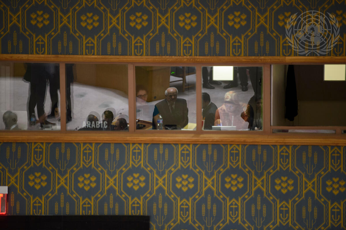Riyad H. Mansour (reflection in window), Permanent Observer of the State of Palestine to the UN, pictured in the Security Council chamber before the meeting on the situation in the Middle East, including the Palestinian question.