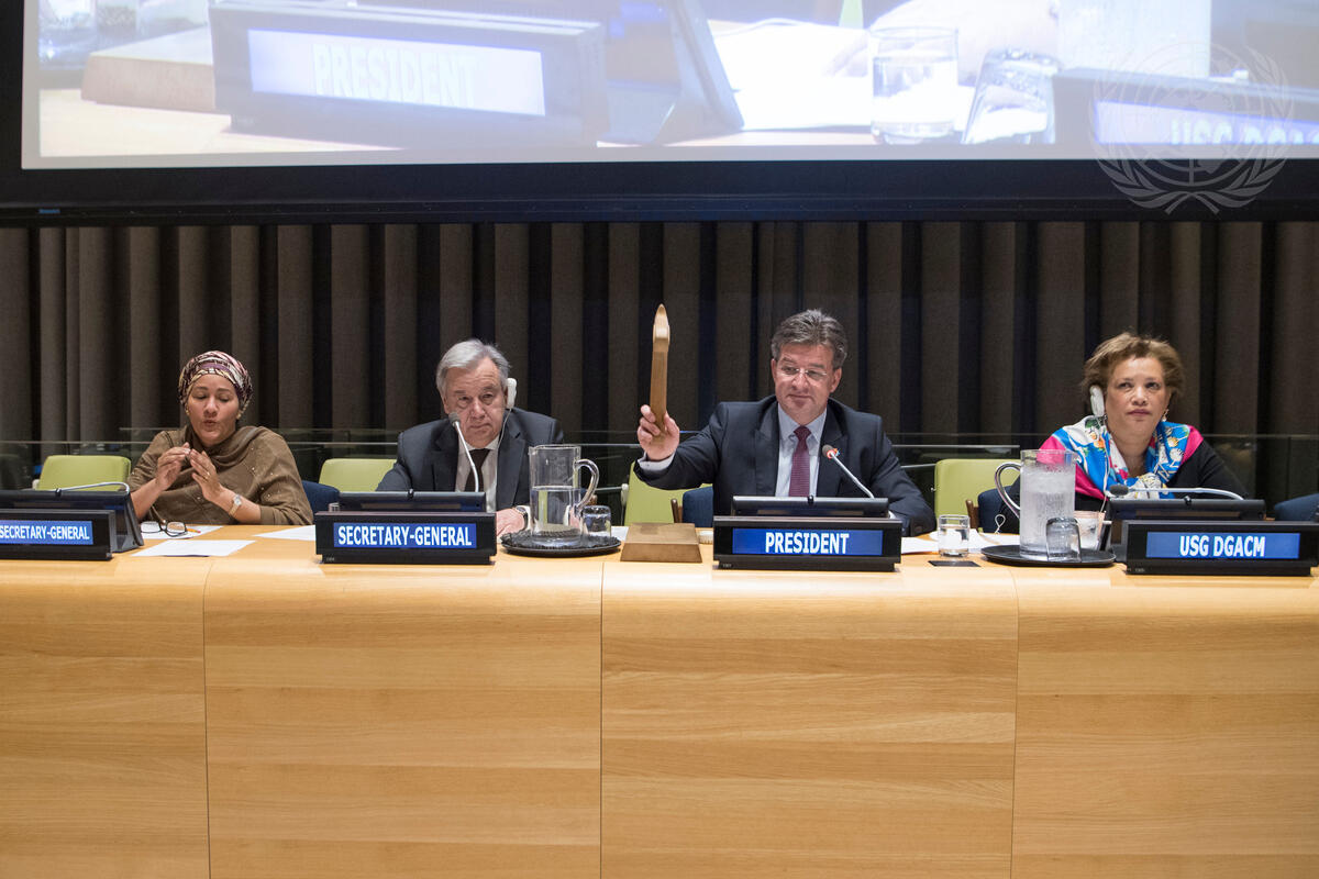 Also pictured are (left to right) Deputy Secretary-General Amina Mohammed; Secretary-General António Guterres; and Catherine Pollard, Under-Secretary-General for General Assembly Affairs and Conference Management.