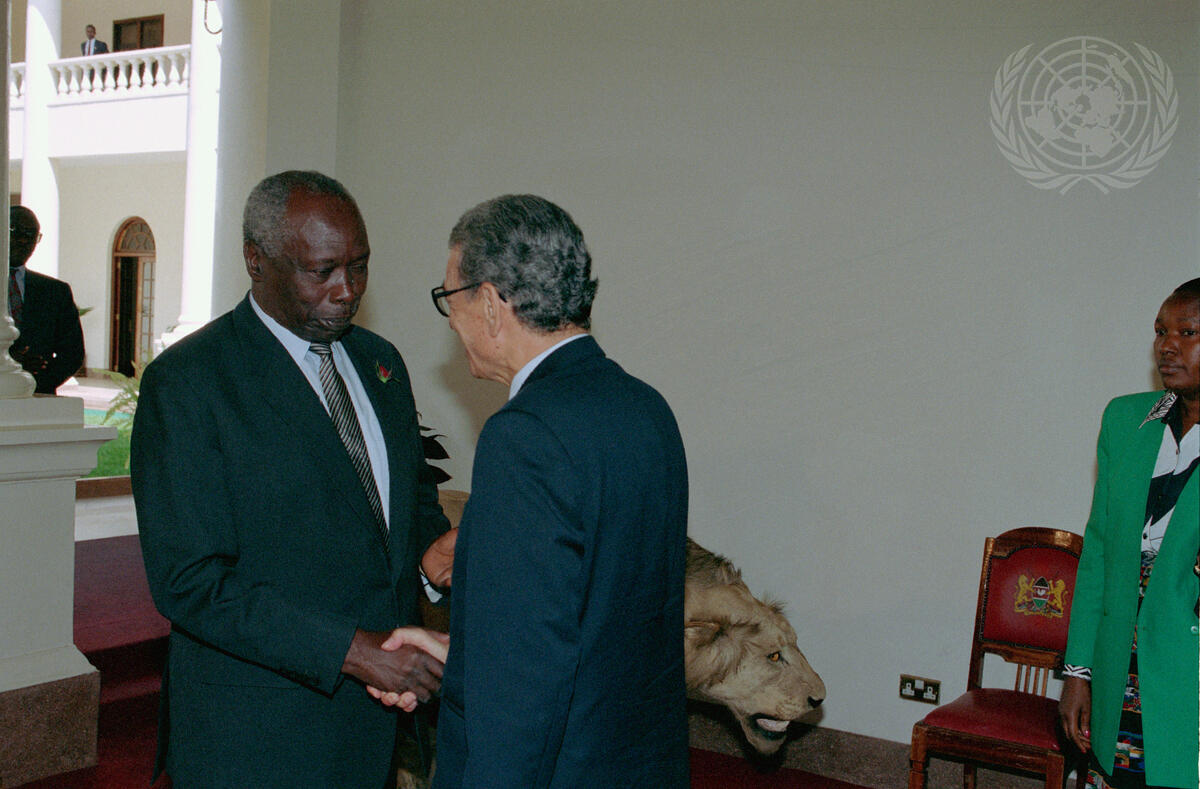 Secretary-General Boutros Boutros-Ghali shaking hands with Daniel Toroitich arap Moi, President of othe Republic of Kenya, at a meeting in the State House.