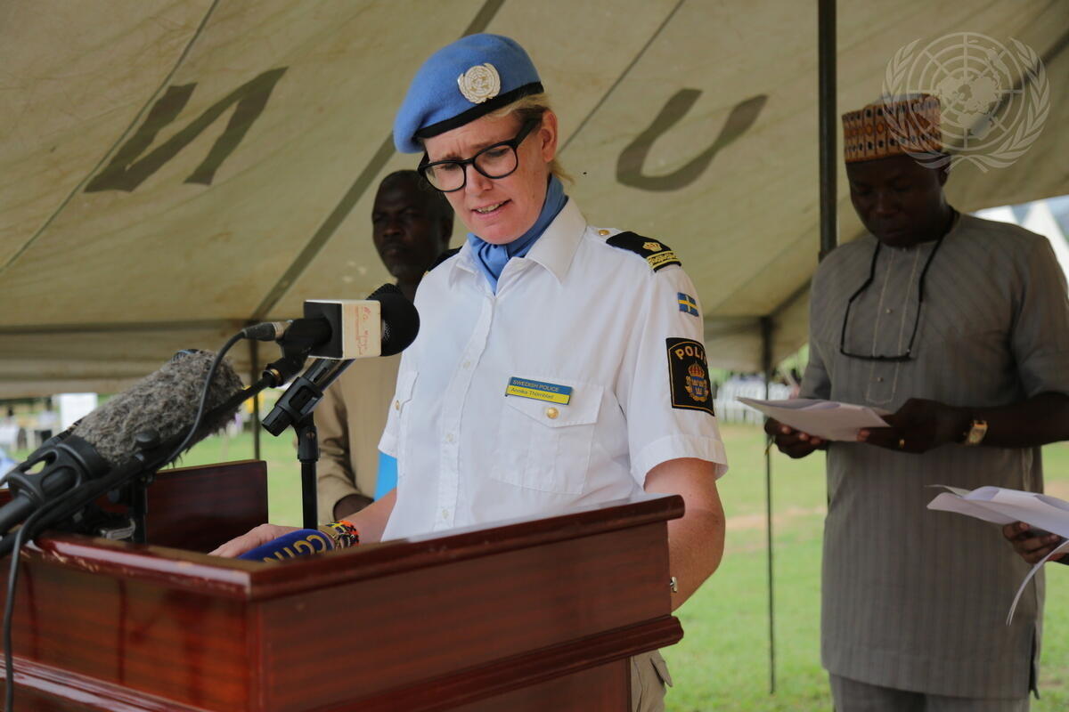 Annika Thörnblad, a Norwegian police officer serving with UNMISS, makes remarks during the ceremony.