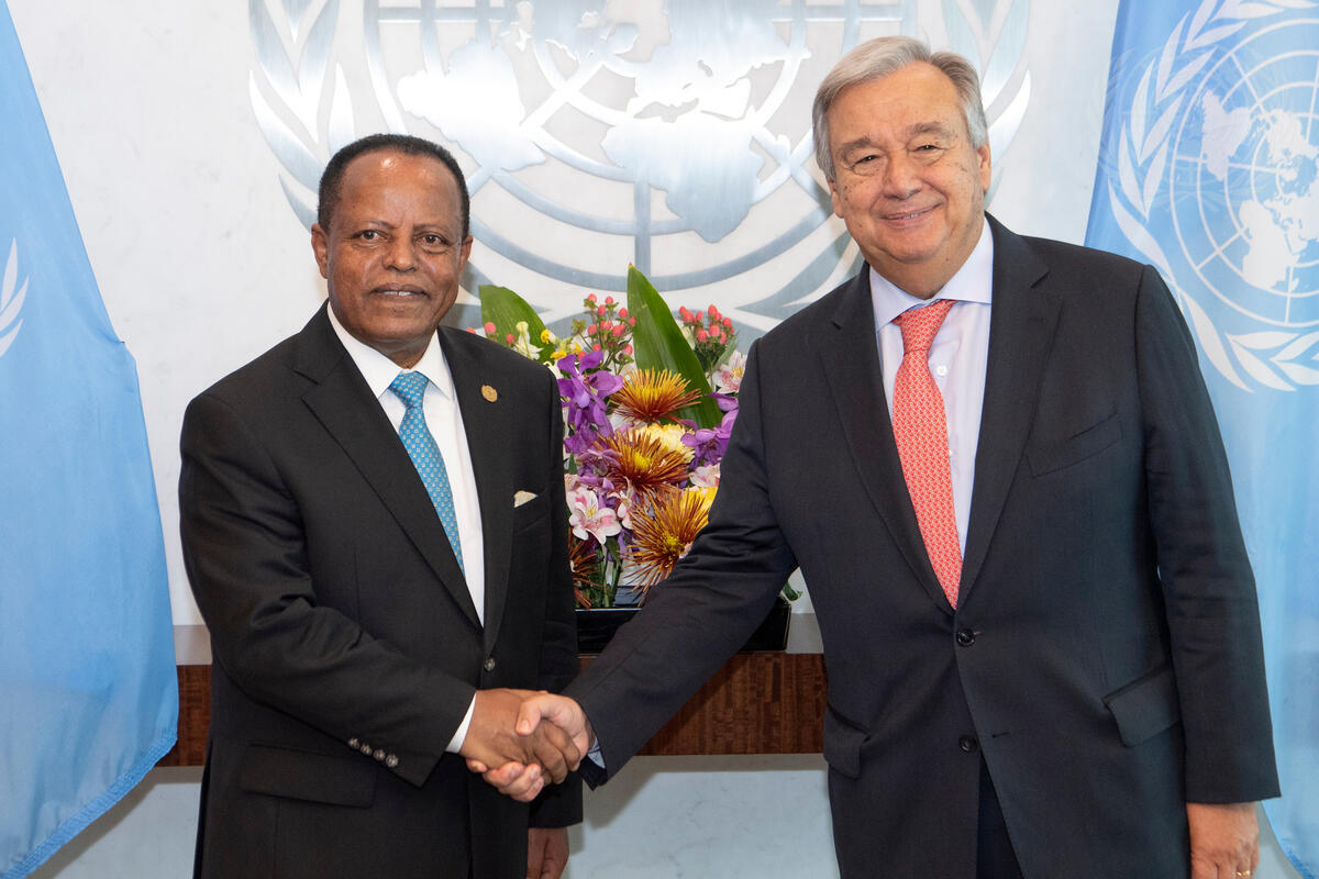 Taye Atske Sellassie Amde (left), new Permanent Representative of the Federal Democratic Republic of Ethiopia to the United Nations, presents his credentials to Secretary General Antonio Guterres.