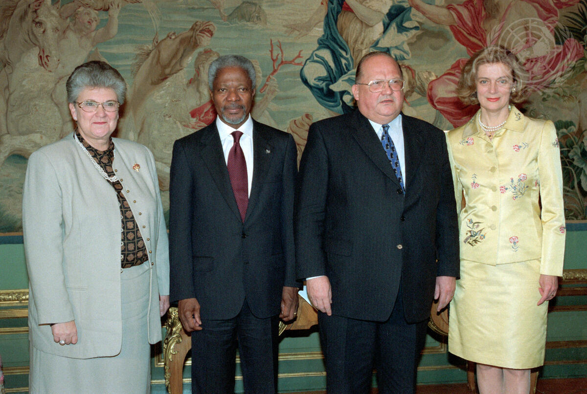 Secretary-General Kofi Annan (second from left) and Nane Annan (right) meeting with Belgian Prime Minister Jean-Luc Dehaene and Mrs. Dehaene, at Palais d'Egmont.