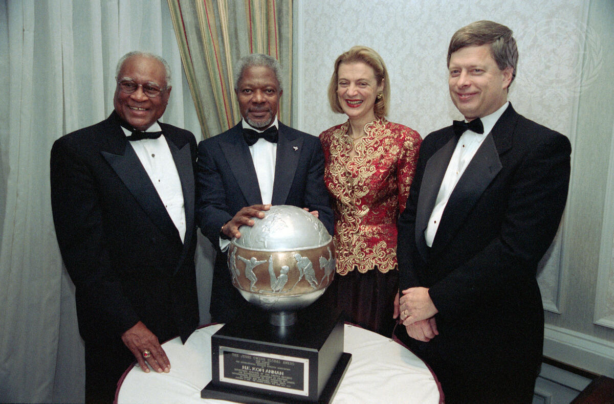 Kofi Annan, Secretary-General of the United Nations, receives Jesse Owens Global Award for Peace, at a dinner hosted by the International Amateur Athletic Association at the Waldorf Astoria Hotel. Photo shows from left to right: Herbert P. Douglas, President-Emeritus of the Association and founder of the Award; the Secretary-General; Mrs. Nane Annan, and Mark A. Nordenberg, Chancellor of the University of Pittsburgh and Chairman of the Award Selection Committee.