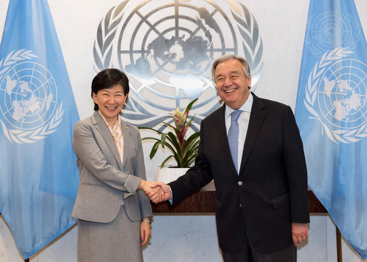 Secretary-General António Guterres (right) with Izumi Nakamitsu, newly sworn-in Under-Secretary-General and High Representative for Disarmament.
