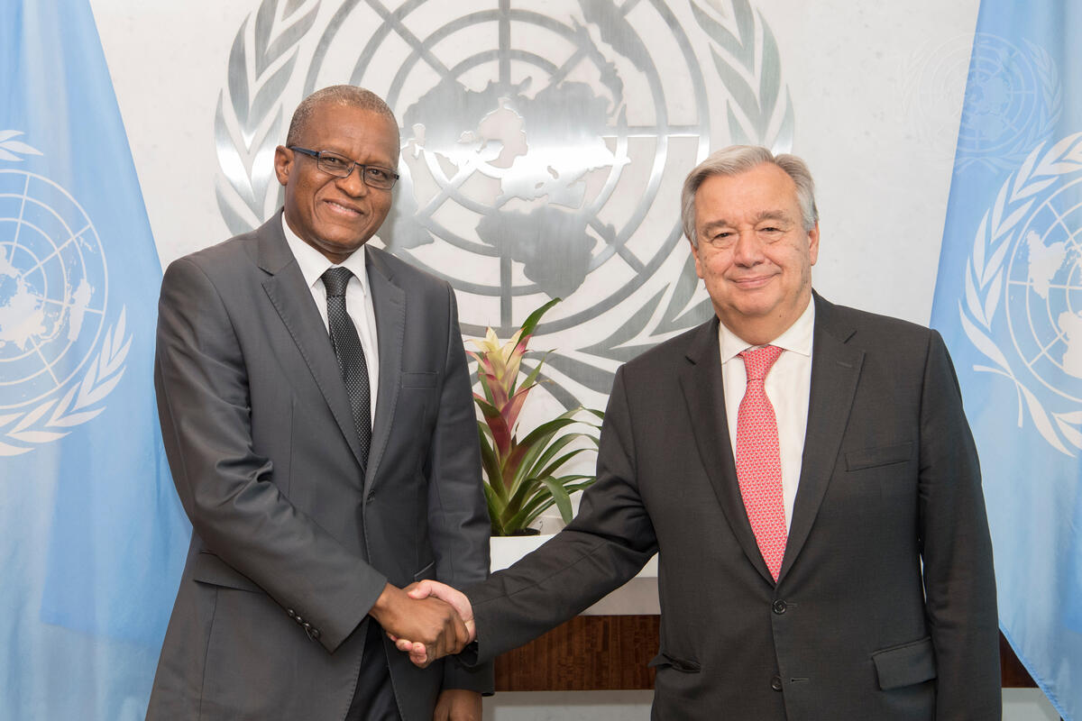 Secretary-General António Guterres (right) meets with Maman Sambo Sidikou, Special Representative and Head of the UN Organization Stabilization Mission in the Democratic Republic of the Congo (MONUSCO).