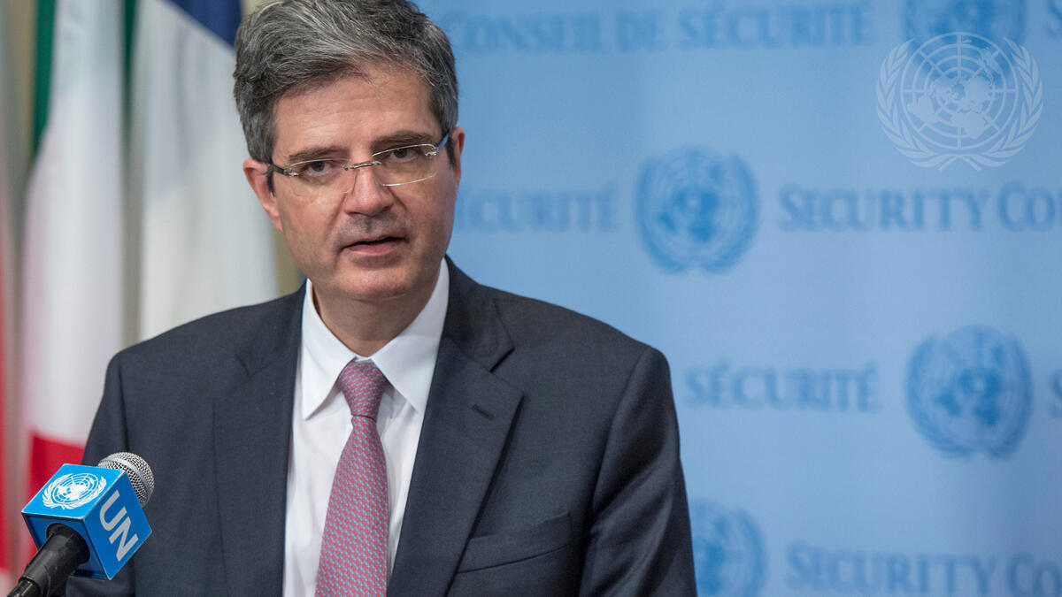 François Delattre, Pemanent Representative of France to the UN and President of the Security Council for the month of October, speaks to journalists at the Security Council stakeout following Council consultations on the situation in the Democatic Republic of the Congo.