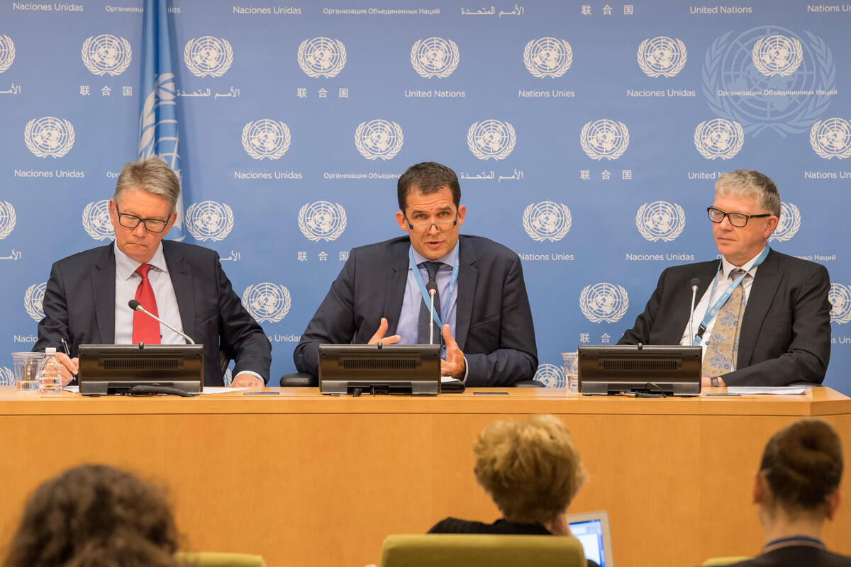 Nils Melzer (centre), Special Rapporteur on Torture and Other Cruel, Inhuman or Degrading Treatment or Punishment, briefs journalists on his mandate. He was joined in addressing reporters by Jens Modvig (left), Chair of the Committee against Torture; and Malcolm Evans, Chair of the Subcommittee on Prevention of Torture.