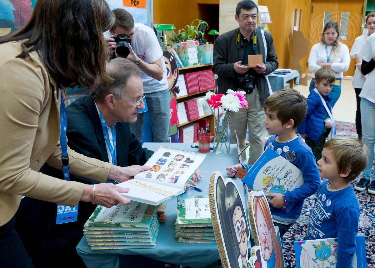 Michael Møller (seated left), Director General of UNOG, signs copies of the book ""Fairy Tales for a Fairer World"" for children during the Open Day.