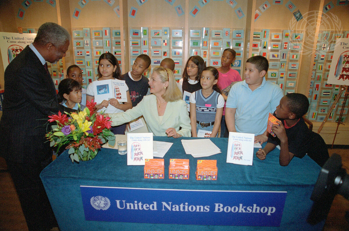 Mrs. Nane Annan signs copies of her new book, ""The United Nations: Come Along With Me!"" for a group of fans. Published by the American Forum for Global Education, the book aims to introduce young children to the concept of the United Nations and its humanitarian work around the world. All proceeds from sales of the book will go to the United Nations Children's Fund (UNICEF).