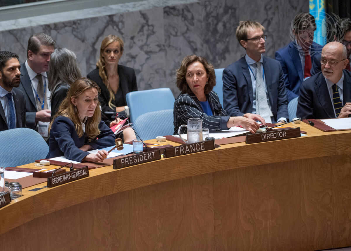 The representative of France (left) chairs the Security Council meeting on the situation in Libya. France holds the council presidency for the month of October.