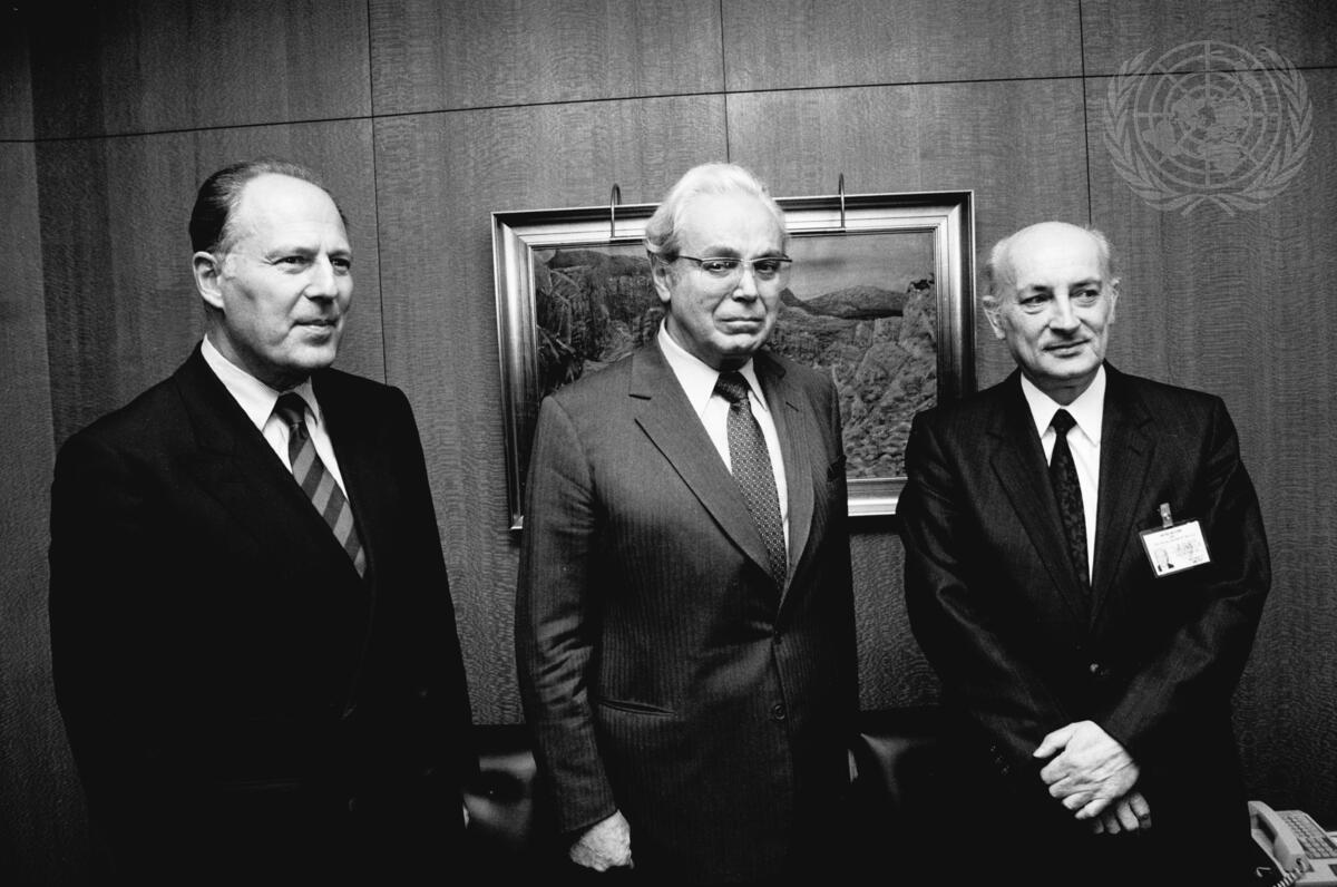 Javier Perez de Cuellar, Secretary-General of the United Nations (centre), meets with Ministers for Economic Cooperation: Hans Wilheim Ebeling of the German Democratic Republic (right), and Juergen Warnke of the Federal Republic of Germany (left).