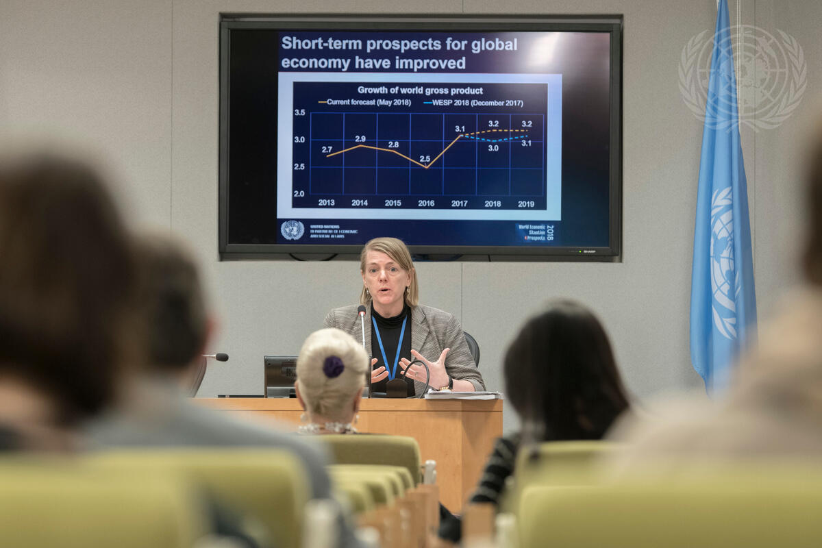 Dawn Holland, Chief of the Global Economic Monitoring Branch, Economic Analysis and Policy Division, UN Department of Economic and Social Affairs, briefs press on the launch the World Economic Situation and Prospects Report as of mid-2018.